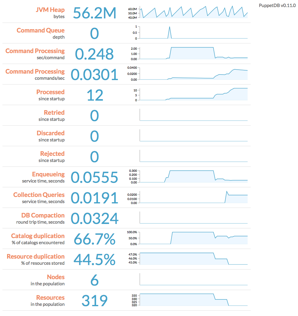 PuppetDB uses this page to display a web-based dashboard with performance information and metrics, including its memory use, queue depth, command processing metrics, duplication rate, and query stats. It displays min/max/median of each metric over a configurable duration, as well as an animated SVG “sparkline” (a simple line chart that shows general variation). It also displays the current version of PuppetDB and checks for updates, showing a link to the latest package if your deployment is out of date.
